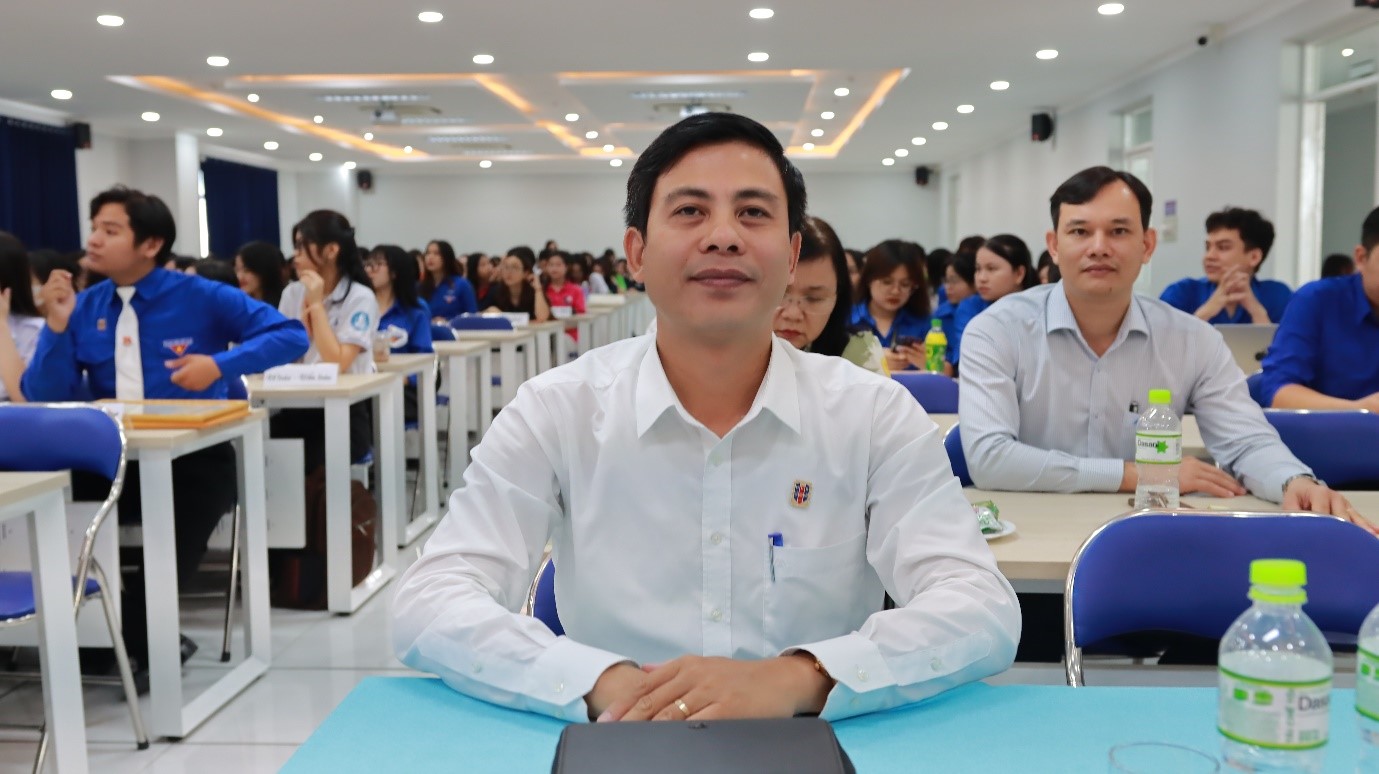 TS. Nguyễn Minh Nhật - Bí thư Đoàn trường phát biểu nhận định về những mặt được, những tồn tại trong công tác Đoàn và phong trào thanh niên trường Đại học Ngân hàng TP. Hồ Chí Minh trong năm học 2022 - 2023 và triển khai chương trình năm học 2023 - 2024